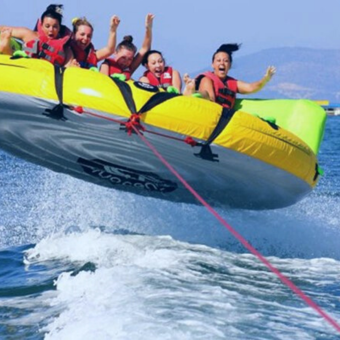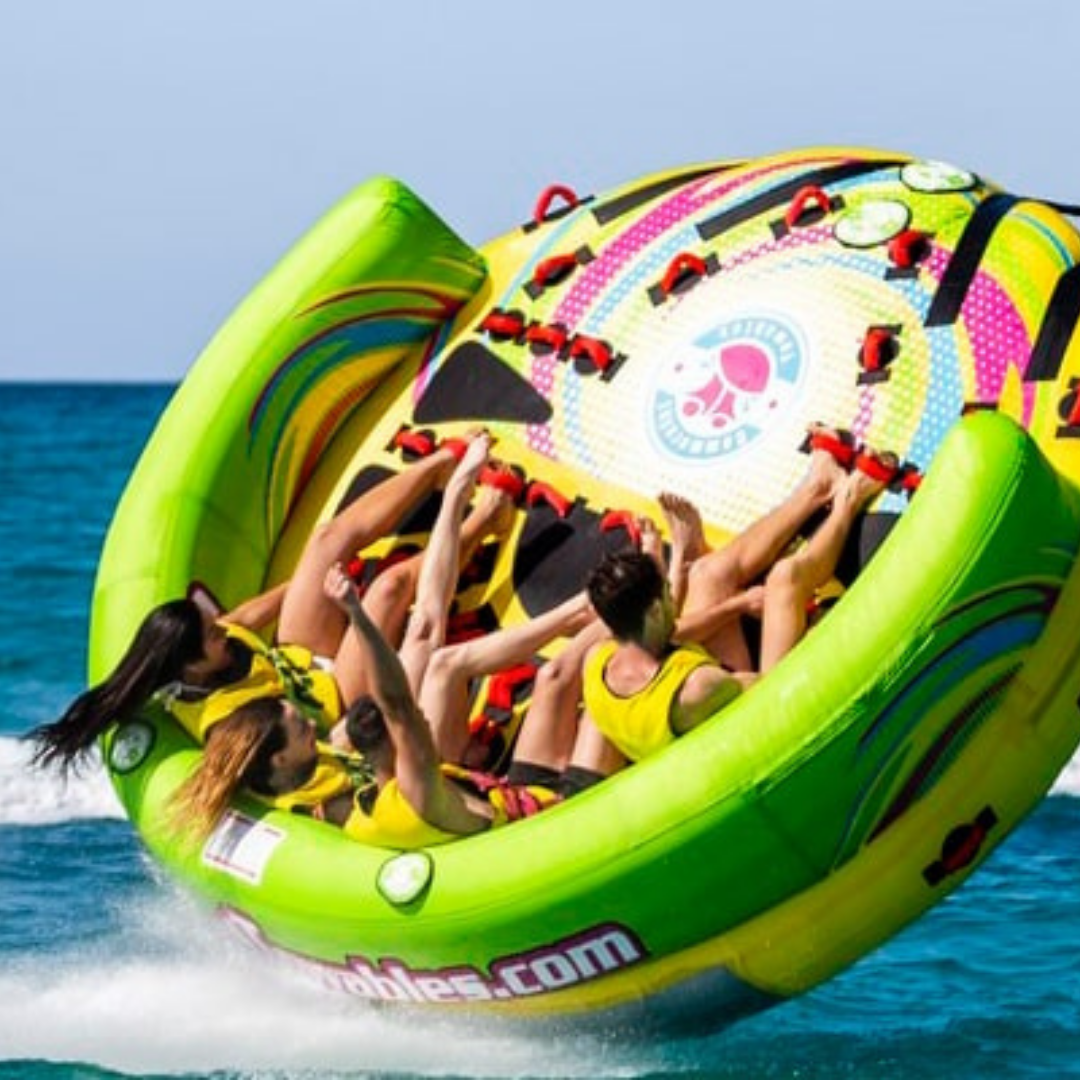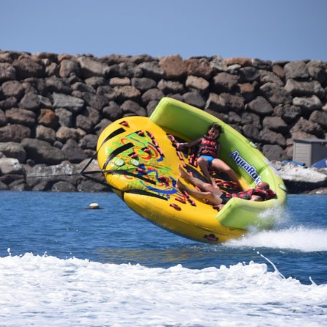 Imagínate con tus amigos en un hinchable acuático con forma de sofá atado a una lancha motora que se encargará de tirar del hinchable a toda velocidad. Pero cuidado, este sofá no es como el típico sofá al que tú y tus amigos estáis acostumbrados… Este da vueltas, botes, zarandeos, giros… ¿Te acuerdas del típico toro mecánico? Pues algo parecido, pero en agua. ¡Y a toda velocidad sobre el mar!